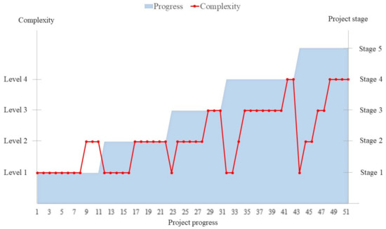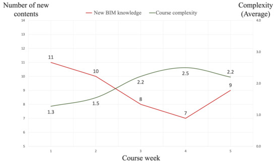 We use the developed content–complexity curve as the segmentation strategy. The construction project was divided into five major stages. Each course week included one project stage for students to learn the modeling process step by step. Fifty-one videos were developed for the course. In the five-week course, the complexity of the course increases from the first week on, and the progress of the project is added to the planning considerations. Figure 6 shows the relationship between the complexity and project stage of the course. As shown in the figure, in every week, the complexity of the course will start from the first level and gradually increases to higher levels. Figure 7 shows the content–complexity curve of the designed course. Weekly course complexity is inversely proportional to the amount of new BIM knowledge. When the course complexity is the lowest in the first week, the new BIM knowledge is the highest. It is worth noting that the fourth week is the final progress of the project. The amount of new BIM knowledge is the lowest in this week, as the students are required to focus on the more complex course content.