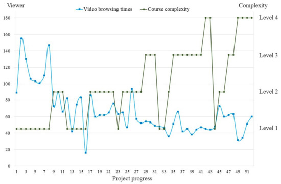 An analysis was performed on the relationship between video browsing times and video complexity. As shown in Figure 10, we found that students had significantly increased video browsing times in the first week of the course. This may be because students needed to spend more time exploring Revit in the first week. In addition, the number of video browsing times changed significantly when the complexity of the course changed from low to high, such as at project stages 17, 36, and 45. The change in the number of video browsing times highlights the advantages of online video. When students encounter problems in the course, they can repeat the learning through replaying the video. Conversely, students with good learning outcomes are free to adjust their learning speed.