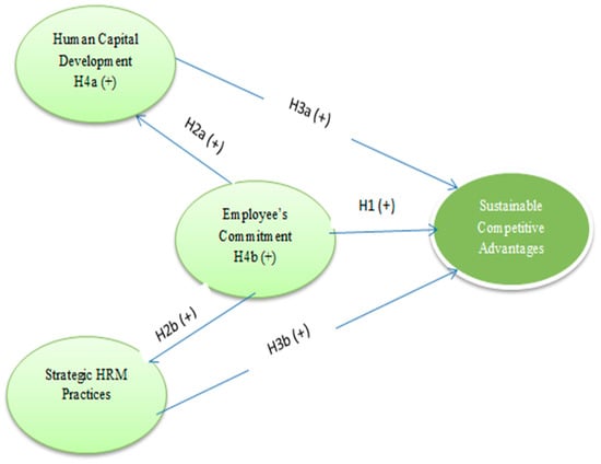 Meanwhile, in the efforts of scholars to examine the nexus in strategic human resources management practices, a behavioral approach has been commonly used. Behavioral approaches, which identify divergent role behaviors as significant to the kind of strategy that is being pursued by an organization, are found in the literature to be the most often used theory to explain the nexus in strategic human resources management (HRM) practices. Much emphasis is placed on individual employee behavior as a mediator between organization strategy and the result by this approach or as a mediator between strategic HRM and SCA [6]. The behavioral school of thought is of the view that divergent behavior roles are important in determining the kinds of strategies that an organization engages in [1]. It has been established in the literature that an employee stands out as one of the major sources of achieving SCA in an organization. Thus, the integrative model for strategic HRM, which combines rational and progressive approaches and is ingrained in some theories—for instance resource-based view (RBV), social exchange theory (SET), and behavioral-based view—are found as an appropriate approach to strategic HRM and SCA. This research utilized the perception of HRM practices to explain in detail from the angle of human capital development and the commitment of employees to their organization. Therefore, this study will examine the relationship between the strategies deployed by the universities in Iraq and the sustainability of their competitive advantages by also evaluating the mediation role of human capital development and employee commitment. In accordance with the theories highlighted above, this study aims at determining the impact of “strategic HRM practices” on the SCA within academic institutions through the evaluation of the mediating function of human capital development and “employee commitment”. The remainder of the paper is structured as follows: Section 2 discusses the theoretical background to the study and development of the hypotheses for the study. This is followed in the subsequent section with research methodology. In this section, the instrument and procedure for data collection are discussed. In Section 4, data analysis techniques employed for the study are discussed; the psychometric properties of the constructs and structural model testing results are also presented. The last section contains a discussion of the results in which the theoretical and managerial implications are discussed, and the study limitations and suggestions for further study are wrapped up the section.