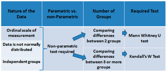 Some steps need to be undertaken to determine the choice of analytical tools and techniques for data analysis, as shown in Figure 2. First, to test if there are significant statistical differences among the groups in comparison, it is imperative to determine then whether the data follows a normal (Gaussian) distribution. If the data follows a normal distribution pattern, then the appropriate technique for statistical analysis is parametric tests (e.g., paired t-test). If otherwise, then the data is not normally distributed. Hence distribution-free methods, or less powerful non-parametric tests, should be employed in order to maintain the accuracy and validity of the data (Pallant, 2005 as cited in [55]). Furthermore, classifying variables according to their scale or level of measurement is another crucial step. According to Mulliner & Maliene, [55], there are some statistical analyses that suites data that are measured at certain measurement scales (i.e., ordinal, nominal, ratio, or interval). Also, the appropriate technique for statistical analysis depends on another criterion—the number of groups considered in the comparison (two or more than two).