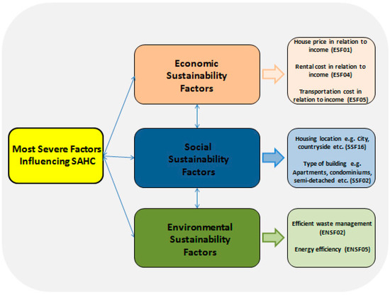 Using principal component analysis, the 30 severe factors affecting SAHC were reduced to seven factors that accounted for 93.4 percent of the total variation in the system. These seven factors were found to be severely influencing SAHC according to the evaluation of the three respondent groups. The factors were House price in relation to income (ESF01), Rental cost in relation to income (ESF04), Housing location, e.g., City, countryside etc. (SSF16), Transportation cost in relation to income (ESF05), Type of building e.g., Apartments, condominiums, semi-detached etc. (SSF02), Energy efficiency (ENSF05), and Efficient waste management (ENSF02). From the PCA result, the framework, as shown in Figure 3 below, was developed.