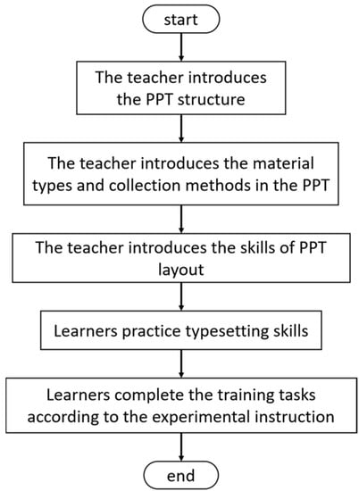 The PowerPoint (PPT) courseware production process was divided into two stages. First, students learned the basic PPT production technology, used PPT for creating learning materials, and then chose a theme to complete the PPT courseware through instructional design and script design. In this stage, the students completed the basic skills based on the experimental instructions provided by the teacher, and completed the corresponding classroom tasks. Second, they exerted their own subjective initiative to endeavor to make PPT courseware, referring to the teacher’s prior information on the social media. Referring to the "PPT Courseware Production Evaluation Form" that teachers had published in advance, the groups improved their PPT production. The arrangement of the 2 hours is shown in