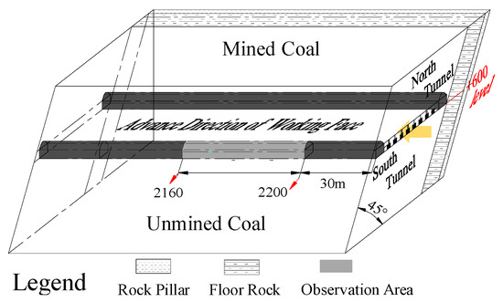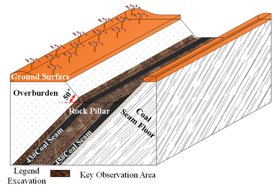 The two work surfaces were stopped at the same time, but the mining of the #43 coal seam lagged behind that of the #45 coal seam from the viewpoint of level height. Currently, the #43 and #45 coal seams are targeted for mining at the +600 and +575 level, respectively.