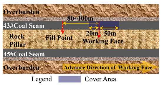Considering the uniqueness of steep coal seams, our literature research [33,34] and field survey revealed that rock beds (or roofs), which are 80 m behind the working surface, serve to stop movement and floors of coal seams are less disturbed and stable. The lag filling method is adopted to fill goafs, as shown in Figure 2.