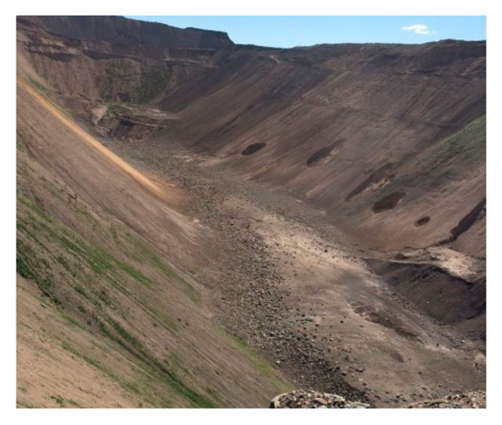 As the upper layer of the coal seam is continuously mined out, the roof strata lose bearing capacity, causing the roof strata to crack and rupture from the stress induced by sublevel mining with large-section caving. These cracks then move freely in the narrow space, causing dynamic disasters. In long-term sublevel mining with large-section caving, fractures in the overburden strata develop to a high level, resulting in the onset of strong mine ground pressure that induces roof–rock–mass caving and collapse of the overburden strata, as shown in Figure 3. Therefore, unstable trough-shaped collapsed pits form on the ground, as shown in Figure 4.