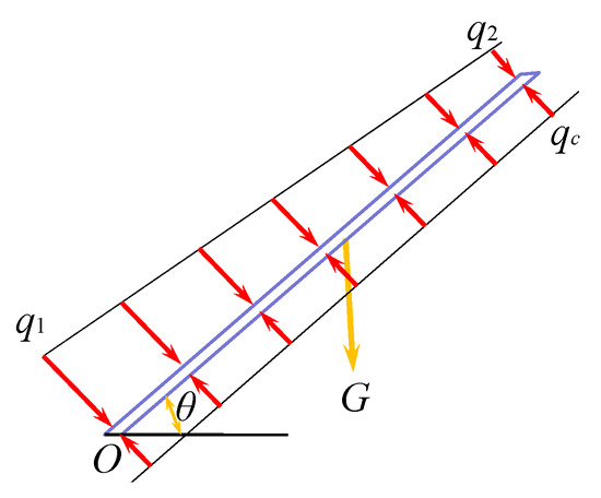 Based on the beam structure theory, the roof can be regarded as a cantilever beam, and we established a mechanical model that considers the effects of mining stress, self gravity, and supporting force of the filling, as shown in Figure 5. The nonuniform load variations from the lower q1 to upper q2 are regarded as the mining stress generated in the roof strata. G is self gravity of the roof strata, uniform load qc is the force of the filling supporting the roof strata, θ is the inclination angle of the coal seam, and L is the length of the beam. Therefore, the effect of cut-and-fill mining can be evaluated based on the bending deflection (ω) induced by multiple stresses on the roof strata.