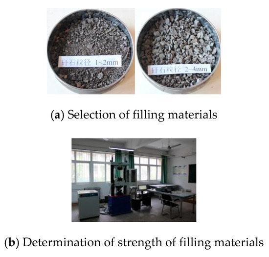 Cut-and-fill mining methods are classified from the viewpoint of locations, dynamics, materials, and filling volume [4,5,6]. After several advances, in recent years, filling technologies in the mines located in China have mostly targeted filling and subsidence restraint the modeling experiment on the movement and failure of overlaying strata being filled with gangue. Jia-chen Wang et al. [7] determined that cut-and-fill mining can limit the deformation, subsidence, and caving of the roof strata directly above the goaf. Hong-sheng Tu et al. [8] extracted the equation according to collapse characteristics of the roofs collapse at steeply inclined coal seams, and analyzed the factors affecting the width of the backfill. Qingxiang Huang et al. [9] reported that the size and effect of filling depend on the strength of the filling material and defined the scope of strength of the filling material in early and late stages of cut-and-fill mining. Based on the discussion based on Gadde theory and numerical calculations, Kostecki et al. concluded that the loading capacity of floor strata can be increased by approximately 10–40% when filled with viscous material to approximately 25–75% of the mining height. Furthermore, they reported that when the shear resistance, tensile strength, and rigidity of the filling are reduced, the enhancement in the strength of a coal pillar is not determined by the filling material [10]. Jixiong Zhang and other scholars from the China University of Mining and Technology conducted systematic and in-depth research and proposed a method for recovering the residual coal pillars left by room-and-pillar mining that utilizes solid-filled coal mining technology. Since then, this has become a comprehensive mechanized solid-filled coal mining technology with independent intellectual property rights. This technology has been successfully applied to mining beneath construction sites and water bodies. Theoretical and practical investigations have shown that this technology can strictly control rock movement and surface subsidence [11,12,13,14]. Xingshang Li [15] proposed the mining and filling balance concept, which considers the balance between the mining and filling capacity, filling volume and supply of filling material, and filling cost and mining profit. The feasibility of filling is described from the viewpoint of achieving balance between mining and filling. To prevent subsidence, it is considered critical to determine the strength of the filling materials.