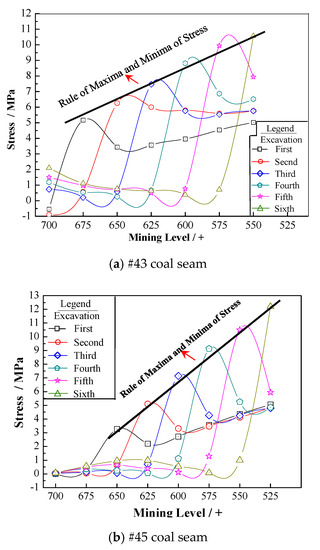 The degrees of fitting between the results obtained using Equation (12) and original stress curves of the #43 and #45 coal seams are 0.989 and 0.996, respectively. In the equation, a and b are constants.