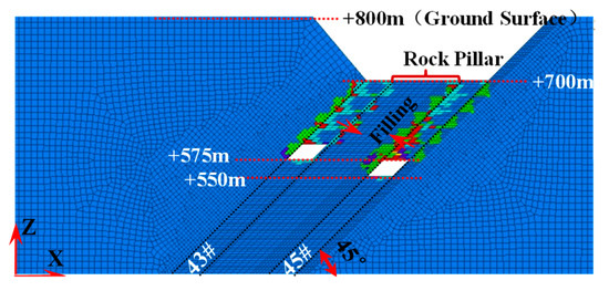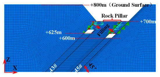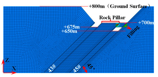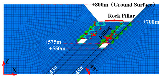 In this model, the steeply inclined coal seams are designed to be mined in six sublevels, with the depth of the bottom level being 150 m. The elevation of the levels of the #43 coal seam ranges from +700 to +550, whereas that of the #45 coal seam ranges from +675 to +525.