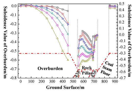 After filling, the surface settlement increases with an increase in the mining depth, but the subsidence remains within 1 m. The combined rock formation (the top of each coal seam) experiences the largest settlement, and the subsidence of the roof of the #45 coal seam was less than that of the #43 coal seam. With an increase in the mining depth, the rock pillars tend to be moderate, and the amount of subsidence at the bottom of the 45# coal seam was relatively large. Upheaval occurred at 0–100 m of the overburden.