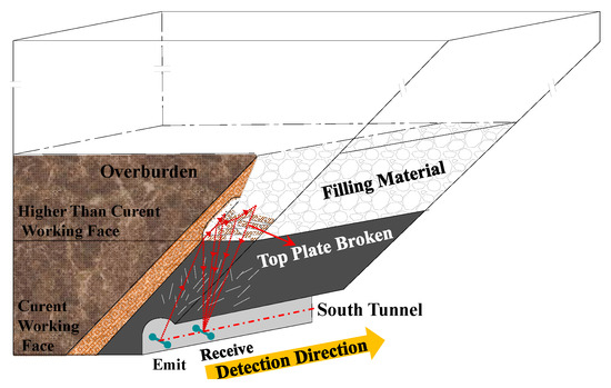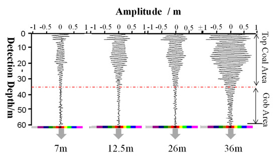Underground strata are a low-loss dielectric material, for which the failure condition and stability can be evaluated based on the intensity of the back waves of pulses. Figure 19 shows the detection principle. The back waves of an electromagnetic pulse emitted by a transmitter can reflect the strata features by different dielectric constants of the strata. Before the ground surface was backfilled, the coal-seam roof achieved stability after a period of movement, whereas the goaf was grouted when the upper level of the coal seam was mined. Thus, the roof was broken, which means the interface either increased or decreased. Consequently, the difference in the dielectric constant on the two sides of the interface widens and can weaken or enhance the electromagnetic wave signal. The backfilling effect and condition of large sections of high roofs can be evaluated by analyzing the images acquired by the geological radar, providing a scientific basis for the assessment of the roof stability.