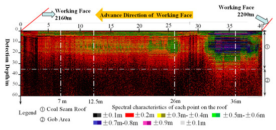 The goaf was detected from the south roadway at the +600 level of the #43 coal seam, with the detection scope ranging from the +600 level to the overburden goaf. Figure 21 shows the difference in the scanning detection feature of the interfaces in the roof strata along the strike direction.