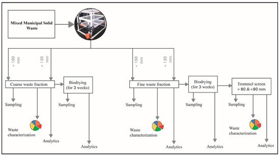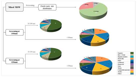 The generated dry materials was afterwards screened in order to separate the coarse fractions, characterized by high heating value, from the fine fractions (“biodried MSW fine fraction”, MSWFF), characterized by low heating values [26,27].