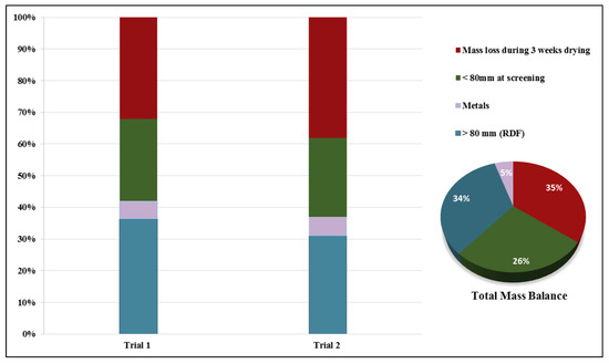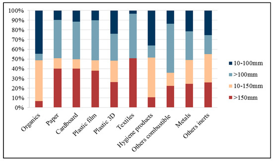 Waste Categories: Material classification was carried out on the basis of the “Methodology for the Analysis of Solid Waste” by the European Commission [28]. A screen unit with 100 mm and 150 mm measurements was used to screen the waste to fractions <100 mm and >100 mm for trial 1 and fractions <150 mm and >150 mm for trial 2, to record the size distribution of the waste.
