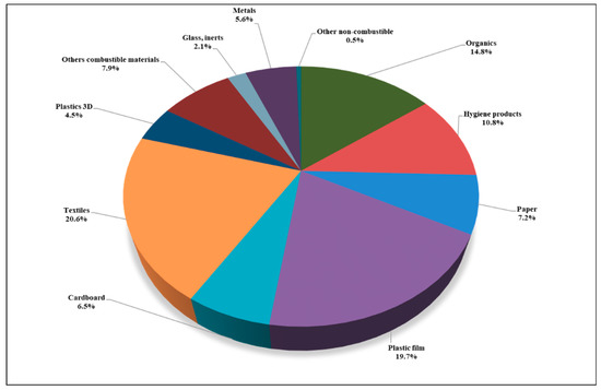 Waste characterization is based on the “Methodology for the Analysis of Solid Waste” of the European Commission [28]. Waste is divided into 18 primary categories. The composition of the total waste delivered shows that the fresh matter in the waste for both trials was strongly dominated by organics. The results of the analysis show that the overall waste composition consisted of four main parts, in the form of organic matter (55.1%), paper and cardboard (11%), plastics (9%), and hygiene products (8.9%). The remainder accounted for 14.9 % of the total and contained textiles (4.7%), metal (3%), glass (2%), composite materials (2.5%), and others. The average results of the fresh municipal solid waste characterization are summarized in Figure 2.