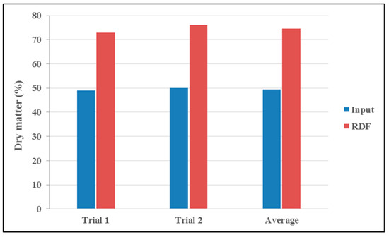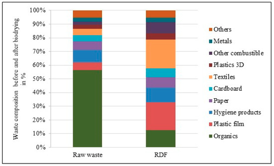 At the end of the bio-drying process, the mass of dried waste directed to the landfill was reduced by about 35%. In the case of the recovery of RDF materials from dried waste, the mass of waste to be landfilled was reduced by 69%. The bio-drying process allowed an increase in the heating value of waste (LHV) by about 58% to reach 15.58 MJ/kg, as a result of the reduction of waste moisture. RDF produced had high calorific value, low water content, and satisfactory chlorine content. With regard to the concentration of the heavy metals, all of the RDF samples tested had lower concentrations than those values set by some European countries.