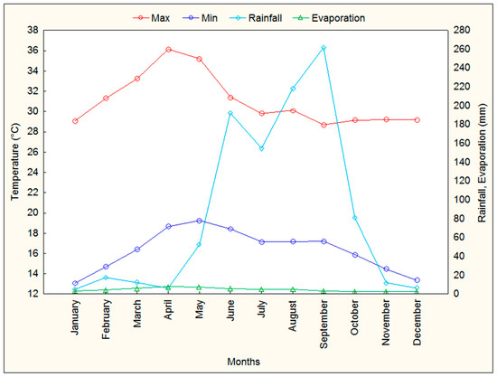 The climate of the site is hot-humid with rainy season in summer. For a period of nine years (2009–2018), an average temperature of 23.7 °C was recorded, reaching the maximum temperature of 36.2 °C in May and minimum temperature of 13.1 °C in January. The annual average rainfall was 1020.8 mm, with the highest value between the months of June–October with 908.9 mm and the regime with the highest amount of evaporation in the March–May period, as shown in Figure 2.