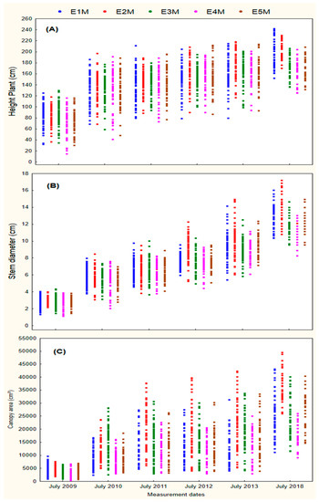 According to Figure 4 and Table S1, an increase in the height dimensions of the plant is observed during the measurements made in July of the years 2009 and 2010 while the increase was lower in subsequent measurements made in the years 2011, 2012, 2013 and 2018.