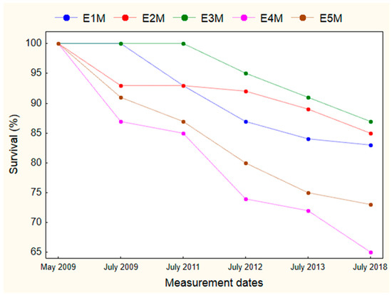 Finally, among the measurements made in July 2013 and 2018, the loss of plants was minimal for the E1M, E2M and E5M ecotypes, while the E3M and E4M ecotypes showed a higher percentage of plant loss. However, in the last monitoring year, July 2018, the E3M ecotype showed the highest survival percentage with 87% followed by the E2M and E1M ecotypes with 85% and 83%, respectively, while the E4M and E5M ecotypes presented the lowest percentage of 65% and 73%, respectively.