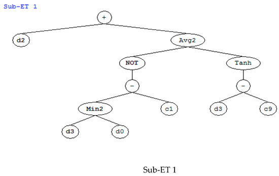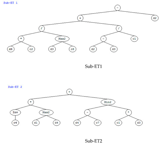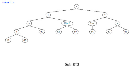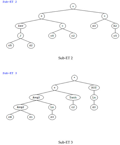 GEP is used to evaluate the 28-day strength of silica fume-blended concrete. The w/b ratio, silica-fume-replacement ratio, water content, and sand ratio are set as independent variables of GEP, and strength is set as a dependent variable of GEP. Figure 1 shows the expression tree of strength. The expression tree equals to the sum of three subexpression trees, i.e., Sub-ET1, Sub-ET2, and Sub-ET3. The equation for the expression tree of strength is shown as follows: