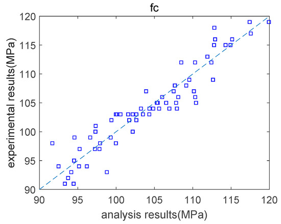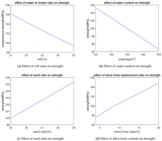 where d0 is w/b ratio (%), d1 is water content (kg/m3), d2 is water content (kg/m3), and d3 is the silica-fume-replacement ratio (%). In Equation (5), the first row, second row, and third row correspond to Sub-ET1, Sub-ET2, and Sub-ET3, respectively. As shown in Figure 2, the analysis results generally agree with the experimental results. The correlation coefficient between experimental results and analysis results of strength is 0.96. In line with the expression tree, a parameter analysis is performed, thinking about the person aftereffect of the w/b ratio, water content, sand ratio, and silica-fume-replacement ratio on strength. Whenever we obtain a result in the parameter analysis, we simply change one variable each time and keep the other three variables as constants. The outcomes from the parameter analysis of strength are presented in Figure 3. Because the w/b ratio and water content increase, the porosity of the concrete increases. Consequently, concrete strength decreases (Figure 3a,b). Next, because the sand ratio increases, the range of the interfacial transition zone decreases, and the strength of the concrete increases (Figure 3c). Third, because the silica-fume-replacement ratio increases, the pozzolanic reaction will make the concrete strength increase (Figure 3d). In reality, these relationships in Figure 3 are not usually direct or linear. For example, compressive strength varies inversely with the w/c ratio through Abram’s generalization law. The trend of regression depends on the source of regression data. When the source of data varies, the specific trends may be different.