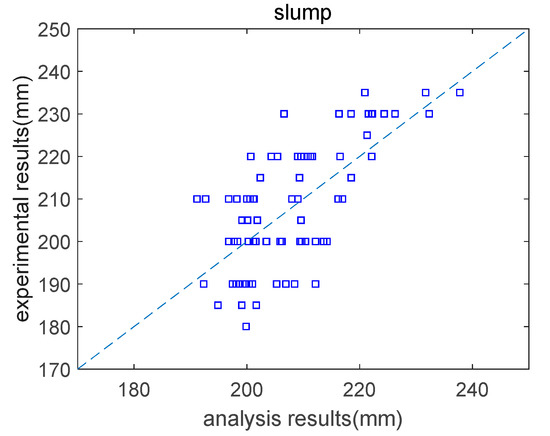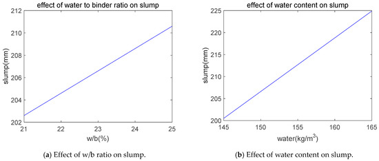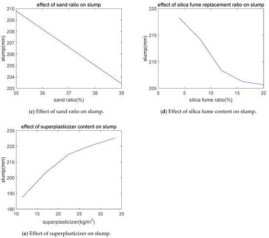 where d0 is the w/b ratio (%), d1 is the water content (kg/m3), d2 is the sand ratio (%), d3 is the silica-fume-replacement ratio (%), and d4 is the superplasticizer content (kg/m3). In Equation (6), the first row, second row, and third row correspond to Sub-ET1, Sub-ET2, and Sub-ET3, respectively. As shown in Figure 5, the analysis results, in general, agree with the experimental results. The correlation coefficient between experimental results and analysis results of slump is 0.71. In line with the expression tree in Figure 4, a parameter analysis is performed, considering the person aftereffect of w/b ratio, water content, sand ratio, silica fume substitute ratio, and superplasticizer content on slump. The outcomes of parameter analysis of slump are shown in Figure 6. As shown in this figure, because the w/b ratio, water content, and superplasticizer content increase, the concrete slump increases (Figure 6a,b,e). For Figure 6e, as the content of superplasticizer increases, the slope of the curve decreases. This is because the content of the superplasticizer is reaching its saturation point, and the water reducing effect becomes weaker at the saturation point of superplasticizer [27]. In addition, because the sand ratio and silica-fume-replacement ratio increase, the concrete slump decreases (Figure 6c,d). For Figure 6d, as the silica fume ratio increases, the absolute value of the slope of the curve decreases. This is because of the increase in the thickness of the paste layer, which can lubricate the flow of concrete.