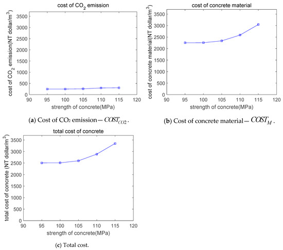 The performances of Mixture 1 to Mixture 5 are provided in Table 6. The next outcome was acquired in line with the items in Table 6. First, because the compressive strength of concrete increased from 95 MPa to 115 MPa, w/b ratio decreased from 0.26 to 0.19, and the silica fume substitute ratio elevated from 0.05 to 0.09. This means that a smaller w/b ratio along with a greater silica-fume-replacement ratio can increase the strength of concrete. Second, the sand ratio for each mixture was comparable to the top of the limit of sand ratio (Table 3). This is because the concrete strength increases with the sand ratio. Third, the slumps for every mixture are higher compared to the required slump of 180 mm. Fourth, as provided in Figure 7, as the strength of concrete increased, the cost of CO2 emissions increased (Figure 7a), the cost of concrete material increased (Figure 7b), and the all-inclusive costs of concrete also increased (Figure 7c). Similarly, Yeh [31] and Kim et al. [32] found the material cost of concrete increases as the increase of the strength of concrete. Park et al. [33] reported the CO2 emission of concrete increases as the compressive strength of concrete increases. Fifth, CO2 emissions cost is about 10% of the fabric cost. Quite simply, the mix design is dominated by material cost, not CO2 emissions cost.