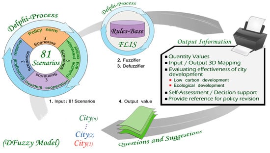 This study compiled 17 criteria that influence low-carbon ecocities. We achieved agreement from 12 experts using the Delphi process on the importance of four criteria: policy norms, resident cooperation, pollution prevention and control, and ecological reserves. Further verification through the Delphi process indicated that the four criteria had a total of 81 types of evaluation scenarios. This study combined the Delphi method and fuzzy logic theory to construct the DFuzzy model. The proposed model has functions by which it performs qualitative and quantitative analysis as well as a scientific quantitative calculation function, high objectivity, and adaptability, the latter of which is convenient for later maintenance and use. Cases of DFuzzy model application suggest that it cannot only evaluate the current low-carbon and ecological conditions of a city but also simultaneously make comparisons between cities and elucidate priorities of developing low-carbon ecocities.