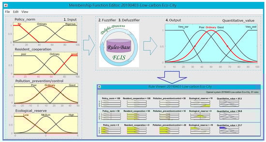 The parameter definitions in Table 1 were agreed upon by all the experts through the Delphi process, and the four criteria were defined in detail as follows: (1) three fuzzy sets of qualitative comparative analysis [45,46]: the semantics were defined as “Rigorous,” “Ordinary,” and “No,” and the fuzzy range was defined as being between 0% and 100%; (2) three fuzzy sets of resident cooperation: the semantics were defined as “Good,” “Ordinary,” and “Poor,” and the fuzzy range was defined as being between 0 and 100%; (3) three fuzzy sets of pollution prevention and control: the semantics were defined as “Good,” “Ordinary,” and “Poor,” and the fuzzy range was defined as being between −30% and 50% and was used to show the completeness of improvement goals; (4) three fuzzy sets of ecological reserve: the semantics were defined as “High,” “Medium,” and “Low”, and the fuzzy range was defined as between −10 and 10 times. It was used to show the number of times that the biocapacity was larger than ecological reserve obtained by ecological footprints. A larger ecological reserve is more desirable. The measurement scale defined in fuzzy logic is an artificially defined fuzzy scale. For example, in the resident cooperation degree, “0” means Poor, “50” means Ordinary, and “100” means Good”. However, is “70” Good or Ordinary? Is “30” Poor or Ordinary? The inference of fuzzy logic is to define the degree by membership functions and finally perform defuzzification through FLIS. The results of the quantized value output are included in this manuscript.