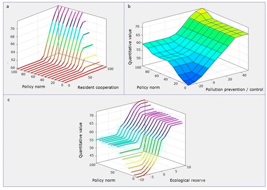 Figure 5 shows the 81 input evaluation combinations of the four criteria. After an inference calculation of FLIS’s AI, the input evaluation combination is converted into a 3D relational diagram of the quantized output. The relationship between the two input criteria (policy norm and resident cooperation) presented in Figure 5a and corresponding quantitative values reveal that, regardless of the strictness of the policy norm requirement, the effect is limited if residents do not have a strong willingness to cooperate. When the willingness of residents is more than 50%, the corresponding quantitative values increase markedly. Moreover, Figure 5b,c illustrate that when the policy norm gradually reaches the goal of pollution prevention and control, the ecological reserve also increases gradually.