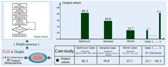 In terms of fuzzy logic theory research design, this study consulted the opinions of Delphi experts in the process of constructing the FLIS. Relevant required parameter definitions of the Delphi–fuzzy (DFuzzy) model included the following: (1) Fuzzy sets: each criterion was set as three scenarios (high, medium, and low or good, ordinary, and poor). The four criteria could be combined into a total of 81 evaluation scenarios. (2) Membership function (MF): the commonly used Gauss–MF and Tri–MF were adopted. (3) Quantified interval values and units of each criterion and the DFuzzy model’s overall quantified evaluation diagram are shown in Figure 3. The steps of the model’s quantification process were sequenced as follows: input scenarios, apply a fuzzifier, apply a defuzzifier, and output the value. A total of 81 evaluation scenarios existed, and thus 81 scenario combinations of quantified evaluation can be applied to cities. Definitions of the relevant parameters of the DFuzzy model are shown in Table 1.