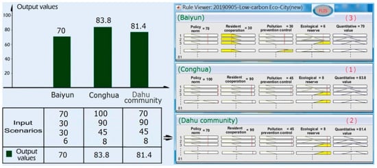 Zadeh [31] suggested that fuzzy logic has the function of computing with words. Specifically, it conducts the quantitative processing of the natural language of humans. The DFuzzy model constructed in this study has functions of qualitative and quantitative analysis. In terms of practical evaluation, three types of low-carbon ecocity (optimal, general, and worst cases) were used to explain the quantitative calculation function of the model. Evaluation combinations of the three case scenarios are shown in Table 2. The quantitative evaluation of the DFuzzy model indicates that the optimal, general, and worst quantitative output values of a low-carbon ecocity were 85.3, 59.8 and 23.7, respectively. A diagram of the application is shown in Figure 6.