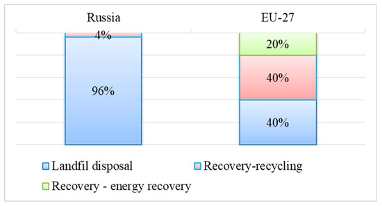 Despite a significant fraction of wastes suitable for processing, the level of processing of solid waste in Russia is extremely low. Although a variety of reprocessing and recycling methods for MSW exist, most MSW (~95% in Moscow) is discarded without preliminary sorting in open landfills [22]. Whereas the EU on average recovers approximately 40% of its waste as reusable materials, and 20% as energy, Russia currently recovers only 4% of solid waste in total. Instead, 96% of solid waste is disposed of (Figure 5).