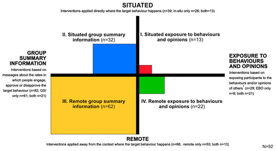 - Context of application (situated vs remote). The contexts in which intervention mechanisms are applied relative to the target behavior (specifically, following Lahlou [27], whether they are applied in the context where the target behavior happens or away from it)