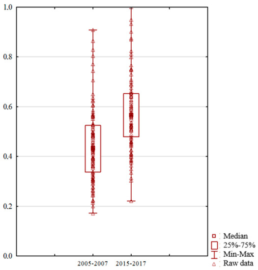 The socioeconomic development level of rural municipalities in the Wielkopolskie voivodeship in the context of the European integration was assessed based on the values of the synthetic indicator developed using the TOPSIS methods. The results of empirical research are presented in Figure 1, in Table 3 and Table 4 and in Map 1. The finding from empirical research is that the general level of socioeconomic development of rural municipalities in the region covered by this study was higher in 2015–2017 than in 2005–2007 (Figure 1). In 2005–2007, the synthetic indicator of socioeconomic development level varied in the range of 0.172 (municipality of Olszówka) to 0.909 (municipality of Suchy Las). In 2015–2017, it varied in the range of 0.221 (municipality of Wierzbinek) to 1.000 (municipality of Komorniki). This means an increase in the range of the synthetic indicator (from 0.736 in 2005–2007 to 0.779 in 2015–2017) and in the median of the indicator which provides a picture of the development level of an average rural municipality in the Wielkopolskie voivodeship (from 0.433 in 2005–2007 to 0.567 in 2015–2017). Hence, the empirical research revealed not only an increase in the general development level of rural municipalities surveyed (as reflected by the increase in the average level of the synthetic indicator) but also a reduction in the socioeconomic development gap between them. This is evidenced by the declining value of the coefficient of variation for the synthetic indicator which was 33% in 2005–2007 and went down to 25% in 2015–2017. However, rural municipalities of the Wielkopolskie voivodeship continue to be relatively strongly heterogeneous in terms of the socioeconomic development level.