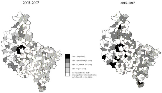 The quartile approach (based on the values of the synthetic indicator) was used to identify four classes of rural municipalities at different levels of socioeconomic development (high, medium-high, medium-low and low). As shown by empirical research, the proportion of rural municipalities at high and medium-high levels of socioeconomic development was higher in 2015–2017 than in 2005–2007 (by 8.8 and 33.6 percentage points, respectively). Also, between these periods, there was a considerable decline in the share of rural municipalities at a medium-low level of socioeconomic development (by as much as 38.1 percentage points). In 2005–2007, most rural municipalities (nearly 64%) in the region surveyed were at a medium-low level, with only every twentieth being at a high development level. In turn, in 2015–2017 nearly 60% and over 14% of rural municipalities in the Wielkopolskie voivodeship were at medium-high and high levels of socioeconomic development, respectively (Table 3, Figure 2). Hence, this study found that Polish rural areas experienced a positive change in their development levels. Most importantly, note that in addition to improvements in the general level of socioeconomic development, there was an accelerated progress in narrowing the gap between underdeveloped and best developed municipalities.