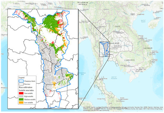 Areas suitable for rice cultivation in the Chaopraya watershed.