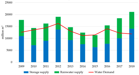 Water demand and supply in the watershed during 2009–18 is presented in Figure 2. As shown in the figure, the results show the positive balance of the supply over the demand, but there is a risk situation because the amount of water demand and supply is close for most of the year with the demand over the supply in the year 2015. Moreover, the bar charts show the data of the total area based on yearly available water without looking at the spatial and temporal effects.