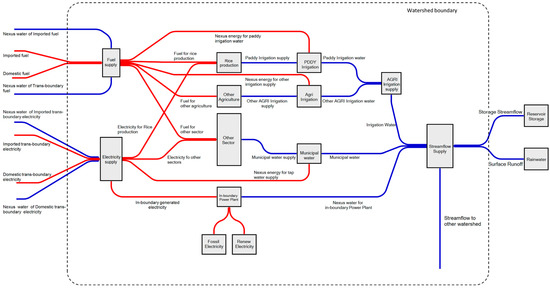 The water resources in the basin are from two sources, the runoff surface water and the trans-boundary water from reservoir storage in an outer basin under the Greater Chao Phraya irrigation project. The direct water utilization comprises three types. Firstly, the direct irrigation water used in annual paddy cultivation and water use in the rice production system. Secondly, the direct consumption in other crops. Lastly, the utilization of other sectors which consist of household, livestock, industrial, and ecosystem service demand. The nexus water utilization is the volume of water used for energy production, which is a function of the in-boundary energy production and trans-boundary energy production, as shown in Figure 3.