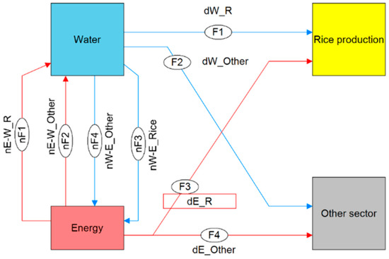 The development of WEF nexus model in this study was adapted from generic WEF nexus framework from FAO [3] to support food security and sustainable agriculture. To analyze the interlinkage among the three components of water, energy, and food, the context analysis was implemented by a preliminary survey, literature review and interview with key stakeholders. The concept structure of the nexus model was set to display the flow of resources (water and energy) supply to food production, especially rice production systems compared to other food production systems and other sectors. Nexus resources use related to the demand for direct resource used can be quantified and displayed in the flow diagram. The parameters and flow components were selected, and interrelationship equations were developed to suit the local context and the main objective of assessing rice production system. The detailed calculation equations of this research are shown in Table 2. The integration system model has been summarized in Figure 4.