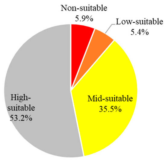 The second, third, and fourth scenarios are changing 160,000 ha of non-suitable, low-suitable and medium-suitable rice cultivation areas in the Chaopraya basin to sugarcane, cassava and maize respectively. The suitability index of paddy rice area was calculated by the Land Development Department of Thailand. The index was evaluated from the soil characteristics data, including physical and chemical properties, monthly rainfall data, crop requirement, forest area, land-use type, etc. The data interpretation and evaluation were performed using GIS and resulting in the final suitable index map, as shown in Figure 1 [66]. The proportions of the land areas in the Chaopraya watershed with different suitability are shown in Figure 5. These scenarios will affect the water and energy consumption of the area since sugarcane, cassava, maize, and paddy rice require a different amount of resources; in this research, we applied the general water and energy consumption of sugarcane, cassava, and maize from Gheewala et al. [67], Pingmuanglek et al. [68], and Jakrawatana et al. [69].