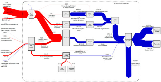 The nexus energy for water is small, accounting for less than 1% of total energy use in the basin. However, when considering only the rice production sector, the nexus energy for water is almost equal to the direct energy use for rice production. On the other hand, compared to the study from Lin et al. (2019) in Xiamen city, China, the nexus energy for water production and supply accounted for 4.5% of total energy use in the city [40]. In South Korea and Indonesia, the nexus energy use for water production accounted for less than 3% [36].