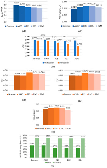 Figure 8a1 reveals that there is an extremely high water withdrawal to availability (WTA = 0.997). Since the water withdrawn for each sector was quite high and close to the basin water availability, thus in the research focus year 2016, the basin was faced with a lower water resource situation, subsequently leading to competition and struggle for water resources for each sector. Applying AWD in Scenario 1 has lower WTA reduction potential than land use and crop change in Scenarios 2, 3 and 4, considering the limited area that can apply AWD without significant adjustment. Scenario 4 exhibited the best potential in WTA reduction because of the great difference in crop water requirements between rice and maize and very low impact on nexus water for energy production. Considering the Water Stress Index (WSI) score from Figure 8a2, owing to the WSI methodology applied in this research, which considers the seasonal water demand and availability, changing crop plantation can reduce the stress in dry season significantly resulting subsequently in annual WSI reduction. The wet season has high stress because of the shift in the rainy period and the limited storage water used to retain the planted crop during the drought period. Scenario 4 has the best performance to reduce water stress in the dry season but has the second performance to reduce water stress in the wet season. The study from another region that has the similar characteristic of intensive rice production area like Juru watershed in Penang State, Malaysia WTA has an extreme water stress at 0.999 [70]. Water eco-efficiency (WEE) analysis results in Figure 8a3 show that Scenarios 2 and 3 changing rice to sugarcane and rice to cassava had the best and second best performance because the higher price of the crop made more benefit than maize in the Scenario 4.