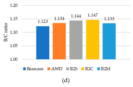 In the third and fourth scenarios (R2C) and (R2M), land-use change from paddy cultivation to cassava and maize were applied. Both scenarios have the same potential to reduce direct water withdrawal by 19%, which is better than Scenario 2. The nexus energy for water of the third and fourth scenarios was reduced by 19% and 20%, respectively. The direct energy consumption and nexus water for energy are not different from the base case. Therefore, in terms of water and energy conservation, they are better than Scenarios 1 and 2. However, eco-efficiency and benefit and cost analysis are evaluated in the next section to look at more detailed implications.