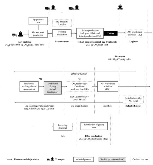 - Upon each operation, the Merino t-shirts are to be laundered prior to reuse/refurbishment and redistribution. AM is currently considering a combined washing and drying machine based on liquid CO2. The process was omitted, as no data could be obtained and since it is only expected take place once every six months.