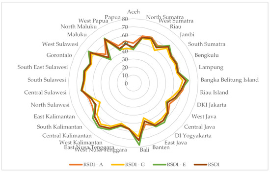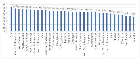 Table 3 depicts the scores and ranks of the RSDI for 33 provinces in Indonesia using three different measurements. As can be seen from Table 3, provinces with high scores on the RSDI, or ones that are put in a higher-ranking position, tend be stable using all three methods of measurement. This is the case for Bali (71.5), Central Kalimantan (67.5), and West Sulawesi (65.26). Similarly, provinces with a lower score on the RSDI (therefore having a lower rank) also tend be consistent from all methods of calculation. This is the case of West Papua (46.15), Aceh (44.39), and Maluku (43.94). In general, it can be said that using weighting factors to measure the RSDI by means of Shannon entropy provides robust results compared with non-weighting factors. The ranking position by means of RSDI entropy is much closer to the aggregate ranking. This implies two things. First, it emphasizes the importance of weighting factors of indicators that contribute to the composite index [18,26]. Second, the weighting factor could capture the trade-off among indicators that contribute to sustainable development. The distribution of the final ranking of the RSDI is depicted in Figure 2, while the spatial distribution of the RSDI across the region is shown in Figure 3.