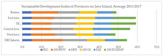 In order to calculate the composite indicators for each province, this study used the average data from the five-year period 2013–2017, so that the resulting composite indicators could be interpreted as an achievement of short-term regional development. In Indonesia, short-term regional development is evaluated every five years. Therefore, using the average of five years of data should result in a meaningful signal regarding the sustainability of the region.