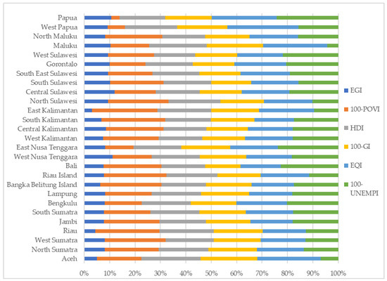 The three indicators that are not in the form of indexes—EGR, UNP, and POV—were normalized first using the formulas described in Equations (1)–(3), respectively, where the maximum and minimum values for each indicator were the highest and lowest values during the period 2013–2017.