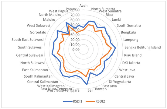 In order to have similar scales with the baseline results, only “the distance to reference province” method of standardization was chosen for the sensitivity analysis. Other methods such as the Z-score and standard deviation methods would result in different scales and would yield the value of zeros in some provinces, which is inappropriate to be used for calculating geometric mean. The result of the sensitivity analysis using the distance from the group leader method (labeled as RSDI2) and its comparison with the baseline (labeled as RSDI1) is presented in Figure 7.