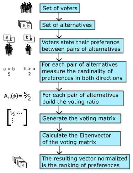 The principal eigenvector of is the most accurate representation of the voters’ preferences, resulting in a ranking of alternatives ordered by their desirability expressed by the set of voters.